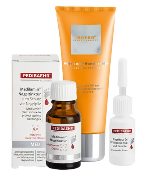 Tynktura Pedibaehr Medilamin® działa silnie przeciwgrzybiczo, a wzmacniający olejek z kiełkami pszenicy wspiera odbudowę zniszczonej płytki. Krem do rąk z marakują uzupełnia pielęgnację, przywracając dłoniom miękkość i gładkość.